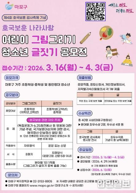 한민일보 서울포커스 박정민 기자 | 마포구는 제4회 호국보훈 감사축제를 맞아 어린이와 청소년이 국가보훈대상자의 희생과 헌신을 기억하고 나라사랑의 의미를 되새길 수 있도록 ‘호국보훈·나라사랑 어린이 그림그리기·청소년 글짓기 공모전’을 개최한다.