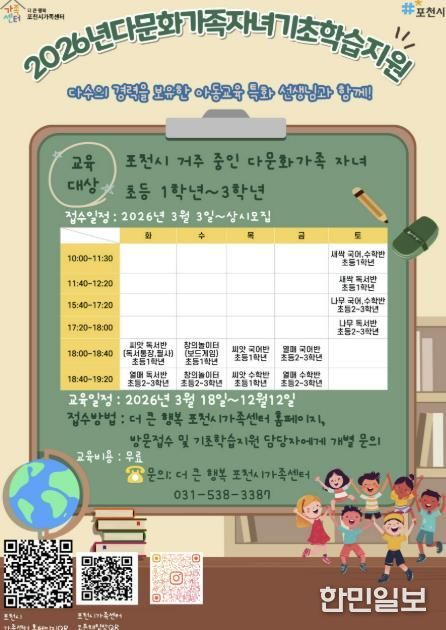 한민일보 서울포커스 심기옥 기자 | 포천시 더 큰 행복 포천시가족센터는 다문화가족 자녀의 안정적인 학교생활 적응과 학습 격차 해소를 위해 ‘다문화가족 자녀 기초학습지원 사업’을 18일부터 본격 운영한다.
