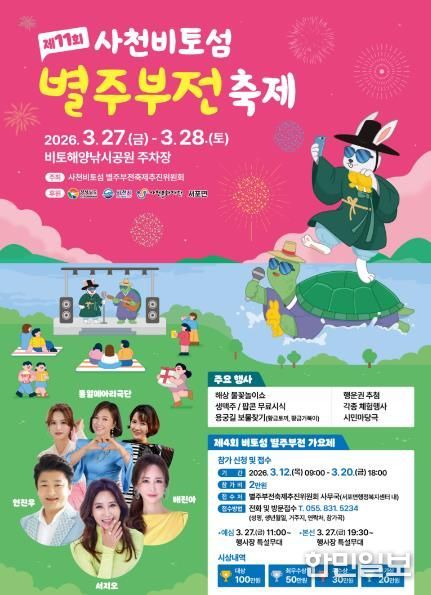 한민일보 서울포커스 김은금 기자 | 사천시 사천비토섬별주부전축제추진위원회는 '제11회 사천비토섬 별주부전 축제'를 오는 3월 27일부터 3월 28일까지 이틀간 서포면 비토해양낚시공원 일원에서 개최한다고 18일 밝혔다.