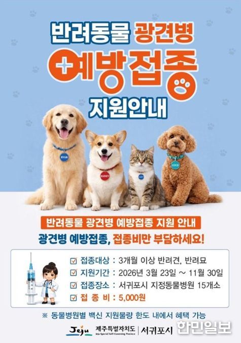 한민일보 서울포커스 김다남 기자 | 서귀포시는 시민과 반려동물의 건강과 안전을 위해 2026년 3월 23일부터 11월 말까지 반려동물 광견병 예방접종을 추진한다고 밝혔다.