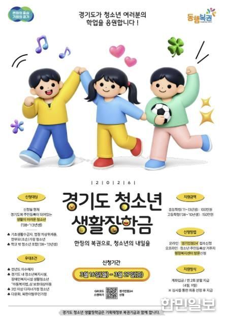 한민일보 서울포커스 최성훈 기자 | 가평군은 복권기금을 재원으로 하는 ‘2026년 경기도 청소년 생활장학금’ 신청을 이달 16일부터 27일까지 접수한다.