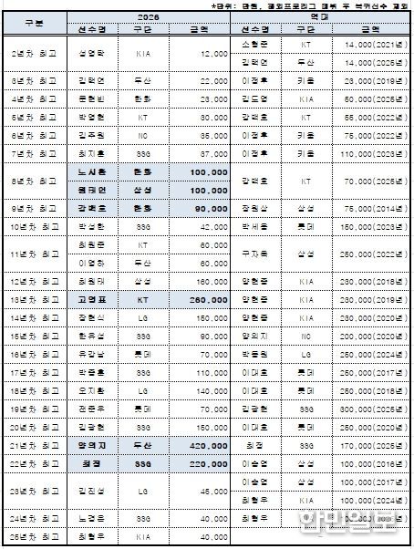 또한 2026시즌부터 시행되는 아시아쿼터 선수들의 연봉도 집계됐다. LG 웰스, SSG 타케다, 두산 타무라가 각각 20만 달러씩 받으며 아시아쿼터 선수 연봉(계약금 포함) 공동 1위에 올랐다.