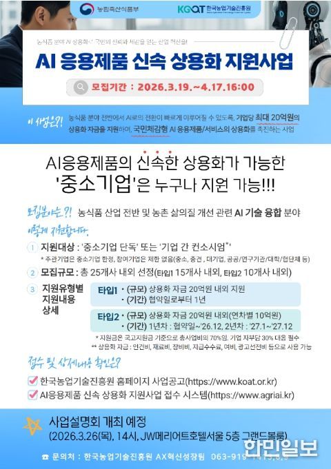 한민일보 서울포커스 임경복 기자 | 농림축산식품부는 인공지능(AI) 기술을 농식품 산업 전반에 적용한 제품의 조기 상용화를 지원하기 위해 ‘AI 응용제품 신속 상용화 지원사업(AX스프린트)’을 3월 19일부터 공고한다.