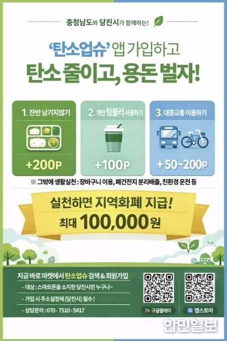 한민일보 서울포커스 임경복 기자 | 당진시는 기후위기 대응을 강화하고 시민들의 자발적인 탄소중립 실천을 확산하기 위해 충남형 탄소중립포인트제 ‘탄소업슈’ 가입자 확대를 본격 추진한다고 19일 밝혔다.