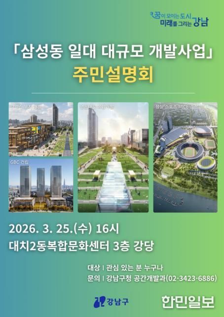 한민일보 서울포커스 박정민 기자 | 꿈이 모이는 도시, 미래를 그리는 강남구가 오는 3월 25일 오후 4시, 대치2동복합문화센터 3층 강당에서 ‘삼성동 일대 대규모 개발사업 주민설명회’를 개최한다.