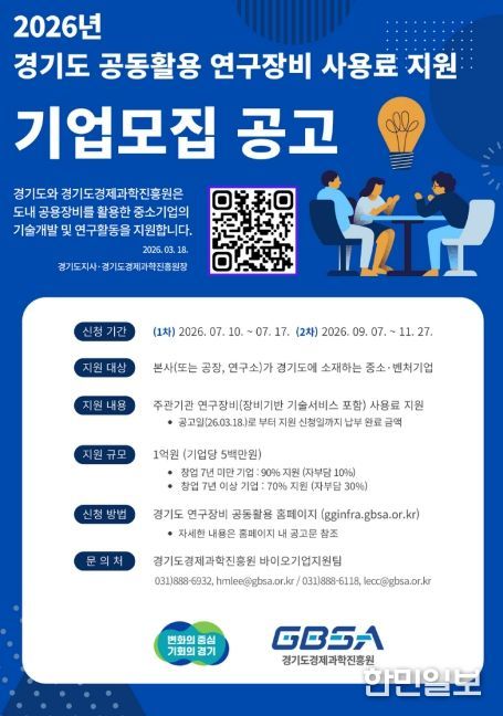 한민일보 서울포커스 김윤이 기자 | 경기도와 경기도경제과학진흥원이 도내 중소·벤처기업의 연구개발(R&D) 경쟁력 강화를 위해 ‘2026년 경기도 공동활용 연구장비 사용료 지원 사업’을 추진한다.