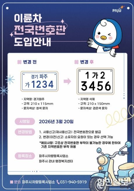 한민일보 서울포커스 진광성 기자 | 파주시는 오는 20일부터 이륜차 전국번호판 제도를 본격 시행한다.