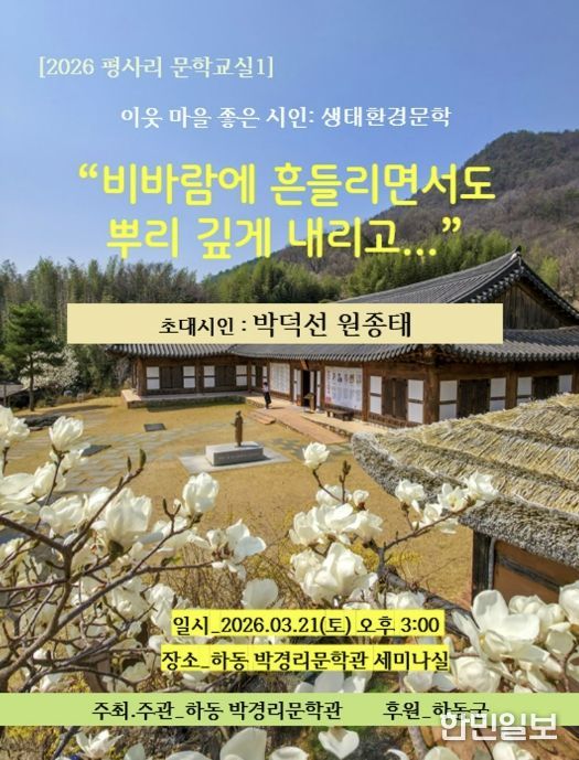 한민일보 서울포커스 김서윤 기자 | 하동 박경리문학관이 오는 3월 21일 오후 3시, 문학관 내 세미나실에서 ‘2026 평사리문학교실1 : 이웃 마을 좋은 시인-생태환경문학’ 강연을 개최한다.