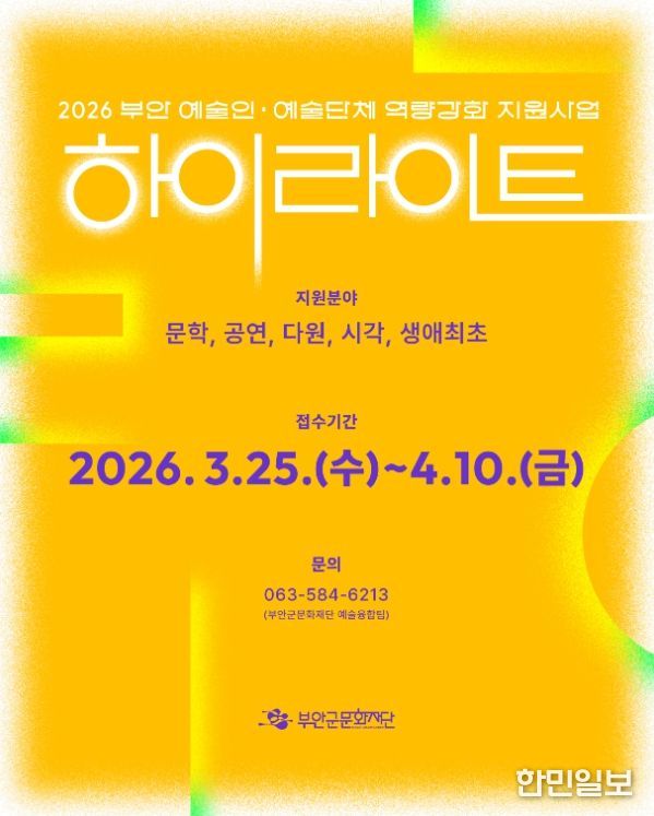 한민일보 서울포커스 김용택 기자 | (재)부안군문화재단은 지역 예술인의 창작 활동을 지원하고 지속 가능한 예술 생태계를 조성하기 위해 2026 부안 예술인 역량강화 사업 '하이라이트' 참여 예술인과 예술단체를 모집한다.