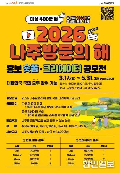 나주시 관계자는 “이번 공모전은 자유로운 형식의 영상 콘텐츠를 통해 나주의 매력을 새롭게 알리고 창의적인 홍보 콘텐츠를 발굴하기 위해 마련했다”며 “많은 국민이 참신한 영상으로 ‘2026 나주방문의 해’ 홍보에 함께해 주길 바란다”고 말했다.