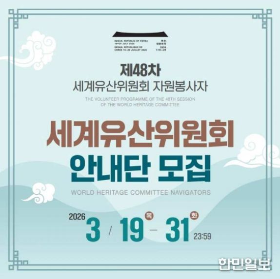 한민일보 서울포커스 박용남 기자 | 국가유산청 제48차 세계유산위원회 회의 준비기획단은 7월 부산에서 개최되는 제48차 유네스코 세계유산위원회 회의(48th Session of the World Heritage Committee)에 국내·외 청년들의 국제회의 현장 참여 기회를 제공하기 위하여 '세계유산위원회 안내단(World Heritage Committee Navigators)'의 참가자를 공개 모집한다.