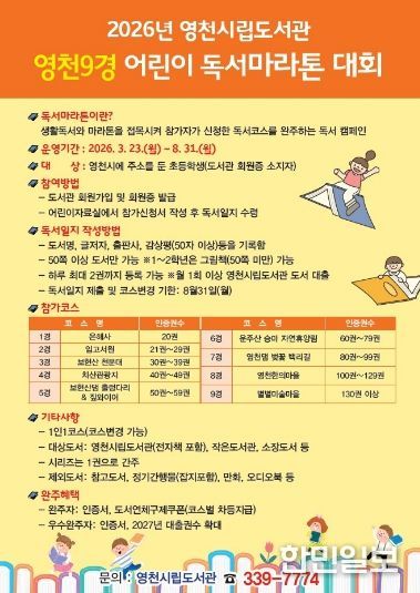 한민일보 서울포커스 김봉순 기자 | 영천시 평생학습관(관장 정경자)은 3월 23일부터 8월 31일까지 초등학생들의 독서 활성화를 위해 ‘영천9경 어린이 독서마라톤 대회’를 운영한다.