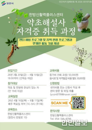 교육 과정은 4월 16일부터 6월 11일까지 매주 목요일 오후 7시부터 9시까지 총 9회 과정으로 운영되며, 검정시험은 6월 18일에 시행한다. 주요 내용은 ▲약초의 기초 이해 및 한방 약초의 효능 ▲주요 약초 식별 및 채취 시기 ▲건조·법제 등 가공 방법 ▲약초 활용법과 금기 사항 ▲스토리텔링 기반 해설 기법 ▲현장 해설 실습 등이다. 자세한 사항은 영천시청 홈페이지 공고문을 통해 확인할 수 있다.