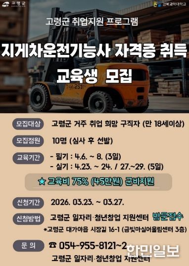 한민일보 서울포커스 임경복 기자 | 고령군은 구직자의 취업 역량강화를 위해 '고령군 일자리·청년창업지원센터'주관으로 지게차운전기능사 취득 지원사업 교육생을 모집하고 있다.
