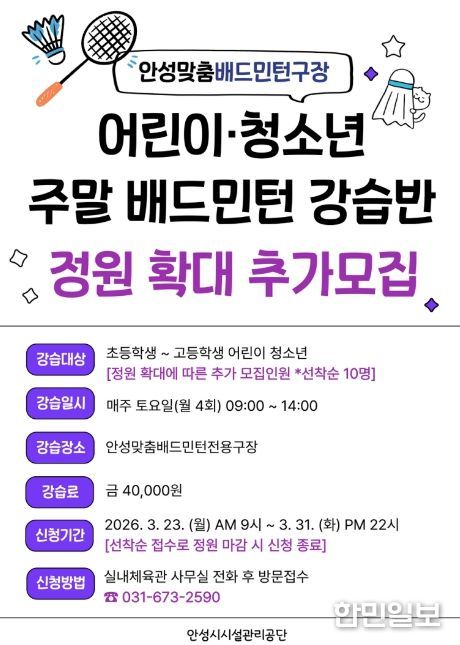 한민일보 서울포커스 임경복 기자 | 안성시시설관리공단은 안성 시민 생활체육 활성화를 위해 현재 운영 중인 주말 어린이・청소년 배드민턴 강습반 정원을 확대하고 추가 수강생을 모집한다고 밝혔다.