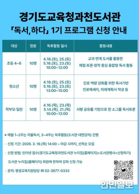 한민일보 서울포커스 김윤이 기자 | 경기도교육청과천도서관이 지역주민의 독서 역량 강화와 융합적 사고력 함양을 위해 '2026년 독서, 하다’프로그램을 운영한다.