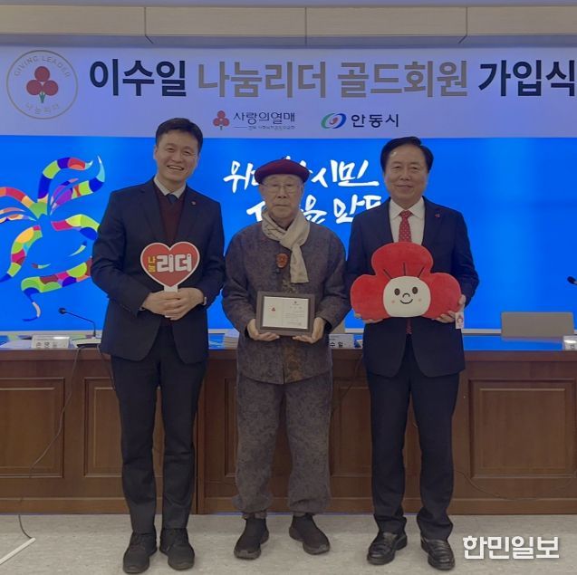한민일보 서울포커스 김봉순 기자 | 안동시는 18일 웅부관 소통실에서 전 안동로타리클럽 이수일 회장에게 경북사랑의열매 나눔리더(골드) 가입 인증패를 전달했다.