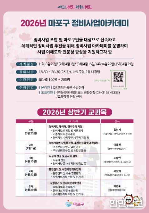 한민일보 서울포커스 박정민 기자 | 마포구는 지역 내 정비사업 조합과 주민을 대상으로 ‘2026년 상반기 마포구 정비사업 아카데미’를 3월 25일부터 4월 29일까지 총 5회차에 걸쳐 개최한다.