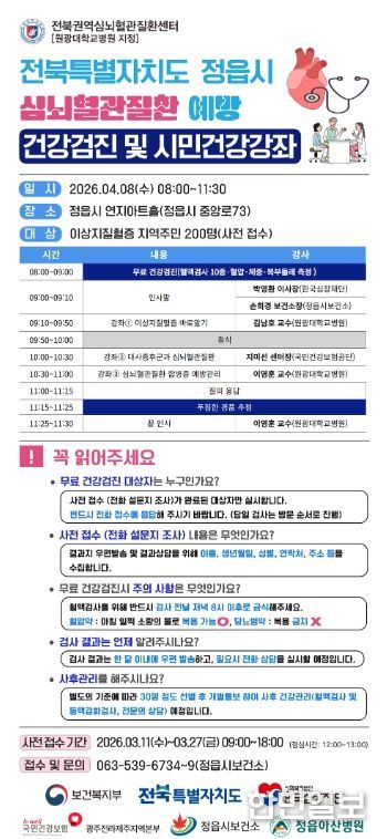 행사는 오는 4월 8일 오전 8시부터 11시 30분까지 정읍시 연지아트홀에서 열린다. 당일 현장에서는 사전 접수한 참여자를 대상으로 10종의 무료 혈액검사를 실시하며 전문의가 직접 진행하는 건강강좌와 맞춤형 건강 교육 프로그램이 차례로 제공된다.