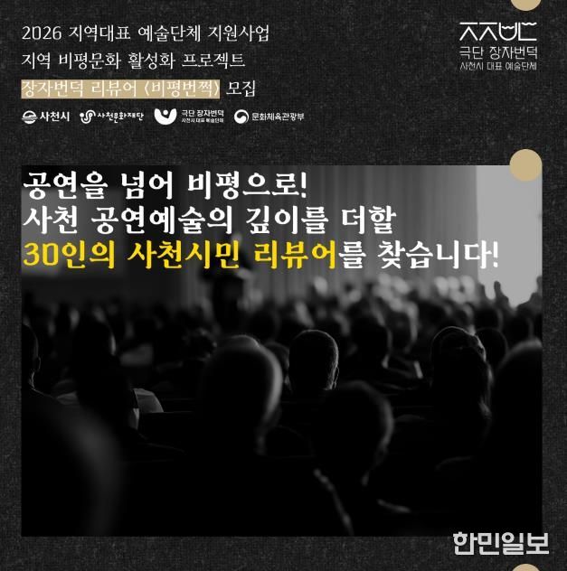 한민일보 서울포커스 김은금 기자 | 사천시, 사천문화재단, 극단 장자번덕이 사천 공연예술의 깊이를 더할 시민 리뷰어 프로그램 '비평번쩍'에 참여할 사천 시민 30명을 오는 4월 3일까지 모집한다.