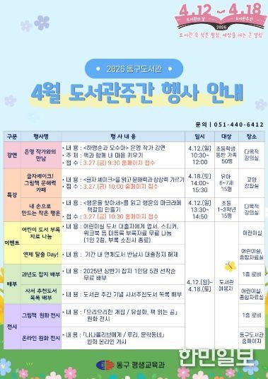 한민일보 서울포커스 임광현 기자 | 부산 동구는 4월 도서관주간(4.12.~18.)을 맞아 동구도서관 및 동구어린이영어도서관에서 다채로운 독서문화 향유 행사를 운영한다고 밝혔다.