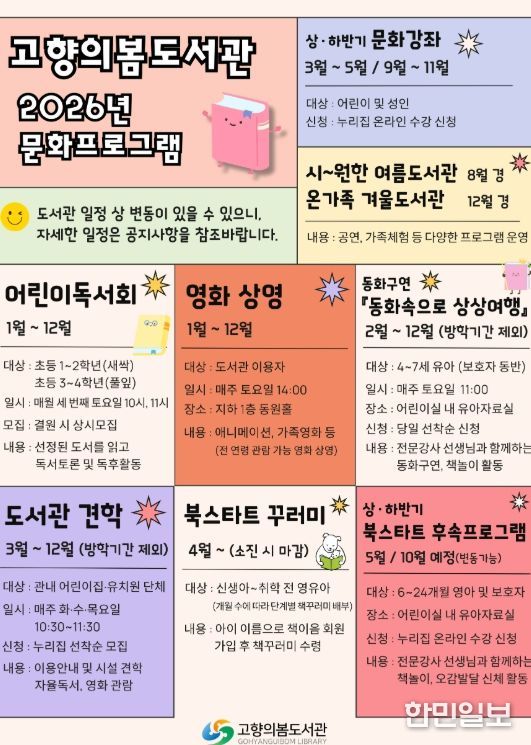 한민일보 서울포커스 김서윤 기자 | 창원특례시 고향의봄도서관은 어린이들이 어릴 때부터 도서관을 자연스럽게 이용하고 책과 가까워질 수 있도록 어린이 독서·문화 프로그램을 연중 운영하고 있다.