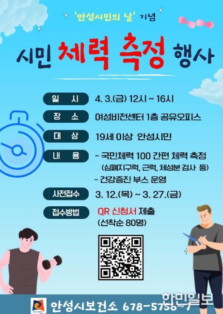 이번 행사는 오는 4월 3일 오후 12시부터 4시까지 안성시 여성비전센터 1층 공유오피스에서 진행된다. 현장에서는 체력 측정뿐만 아니라 심뇌혈관 질환 예방, 신체활동, 금연, 구강 관리 등 건강 인식 향상을 위한 다양한 건강증진 부스도 함께 운영될 예정이다.