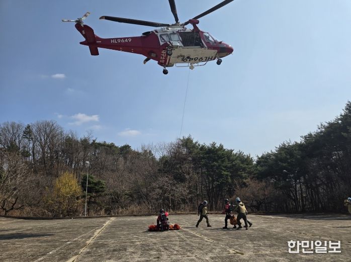 주요 훈련 내용은 ▲구조대상자 응급처치 등 실제 상황을 가정한 실전형 훈련 ▲산악구조 장비 사용법 숙달 및 소방헬기 접근 안전교육▲소방헬기 호이스트를 이용한 환자 인양 및 로프 구조 기술 고도화 훈련으로 진행됐다.