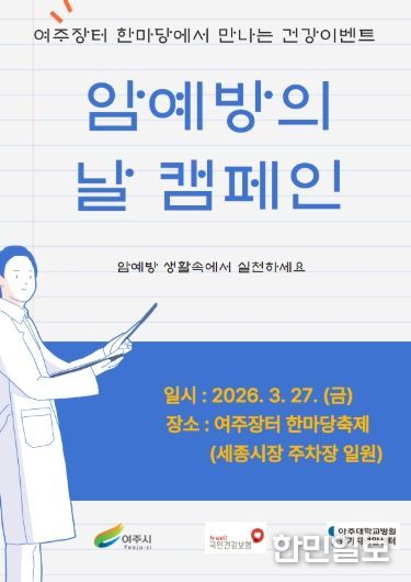 한민일보 서울포커스 전희주 기자 | 여주시 건강증진과는 오는 3월 27일, 세종시장 주차장 일원 ‘여주장터 한마당 축제’ 현장에서 시민과 함께하는 암예방의 날 기념 캠페인을 운영한다.