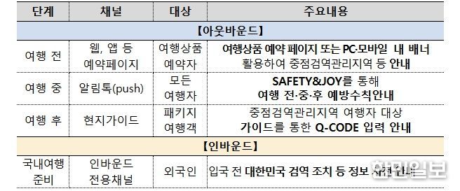 업무협약 내용으로는 ▲여행자 대상 감염병·건강정보 제공 확대, ▲연휴·국제행사 등을 계기로 캠페인 기획·추진, ▲콘텐츠 공동 기획·제작, ▲해외여행 전 주기(예약-출국-현지-입국)에 걸친 협력 방안 발굴 등이다.
