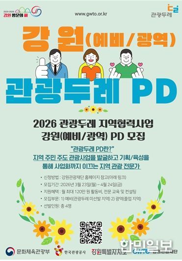 한민일보 서울포커스 곽중희 기자 | 강원특별자치도와 강원관광재단은 지역관광 활성화를 위한 '2026 관광두레 지역협력사업'의 일환으로 ‘강원 PD(예비·광역)’를 공개 모집한다고 밝혔다.