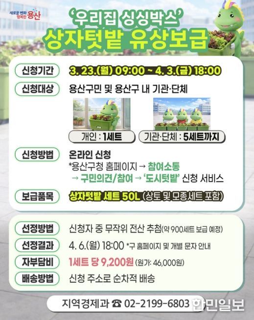 한민일보 서울포커스 김서윤 기자 | 서울 용산구가 아파트 베란다와 주택 마당 등 생활공간에서 손쉽게 작물을 키울 수 있는 ‘상자텃밭’ 보급에 나선다. 소소한 수확의 즐거움과 함께 도시농업을 일상으로 확산하겠다는 취지다.