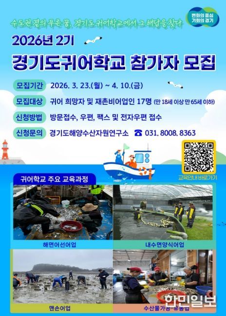 한민일보 서울포커스 김윤이 기자 | 경기도해양수산자원연구소는 귀어 희망자의 어촌 정착을 지원하기 위해 4월 10일까지 ‘2026년 2기 귀어학교’ 교육 프로그램 참가자를 모집한다.