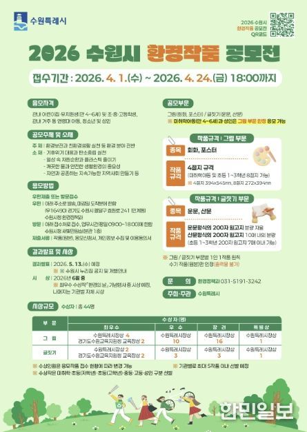 수원시 관계자는 “환경 작품 공모전이 시민들이 환경의 소중함을 되새기고 친환경 생활을 실천하는 계기가 되길 바란다”며 “많은 시민의 관심과 참여를 바란다”고 말했다.
