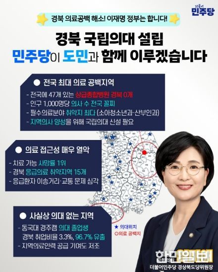 한민일보 서울포커스 임경복 기자 | 더불어민주당 경상북도당 위원장인 임미애 국회의원이 경북 지역의 숙원 사업인 ‘국립의과대학 설립’을 위해 대통령과 주무 부처 장관을 잇달아 만나는 광폭 행보를 펼치는 한편 도민과 함께하는 본격적인 홍보 캠페인에 돌입했다.