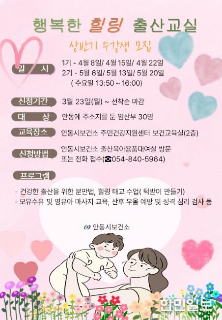 한민일보 서울포커스 김봉순 기자 | 안동시는 임신․출산에 대한 체계적인 정보 제공과 건강한 출산 환경 조성을 위해 예비 엄마를 대상으로 ‘행복한 힐링 출산교실’을 운영한다.