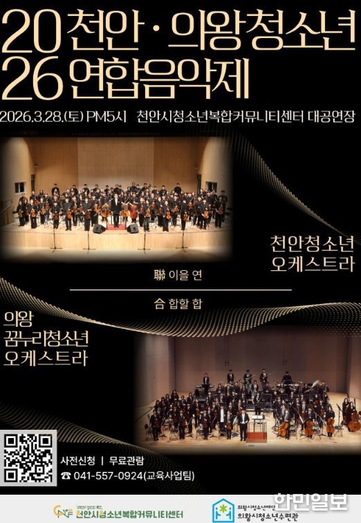 한민일보 서울포커스 황준형 기자 | 천안시청소년재단 산하 천안시청소년복합커뮤니티센터가 오는 28일 센터 대공연장에서 ‘천안·의왕 청소년 오케스트라 연합음악제’를 개최한다고 밝혔다.