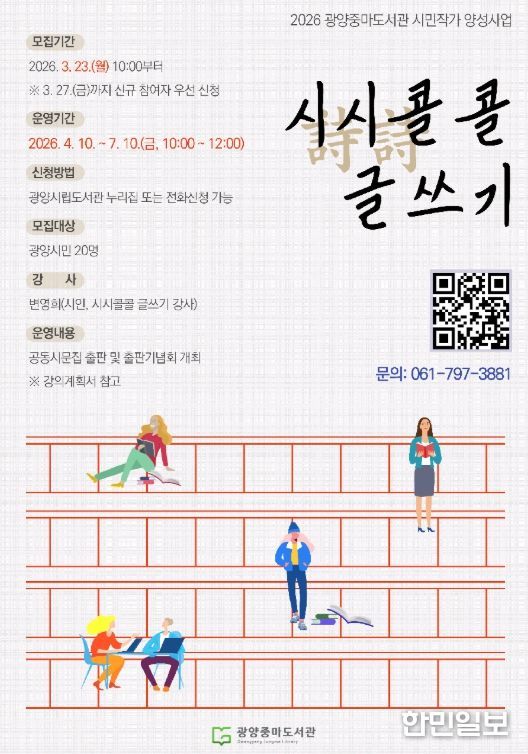 한민일보 서울포커스 임광현 기자 | 광양중마도서관은 시민의 창작 역량을 높이고 문학 활동 참여 기회를 넓히기 위해 1인 1책 '시민작가 양성사업'의 하나로 ‘시시(詩詩)콜콜 글쓰기’ 프로그램을 운영한다.