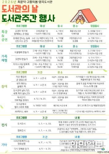 한민일보 서울포커스 김서윤 기자 | 창원특례시 의창도서관과에서는 2026년 도서관의 날(4.12.)과 도서관주간(4.12.~4.18.)을 맞아, 최윤덕·고향의봄·명곡도서관에서 4월 9일부터 4월 23일까지 다양한 독서문화행사를 운영한다고 밝혔다.