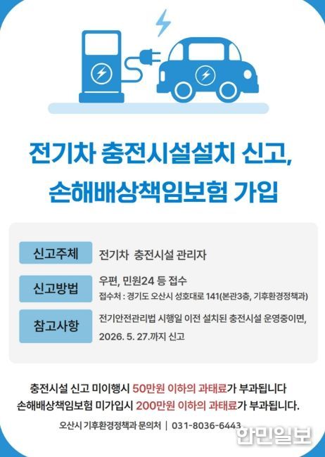 한민일보 서울포커스 임경복 기자 | 오산시는 전기자동차 충전시설의 안전한 관리와 사고 발생 시 피해자 보호를 위해 충전시설 설치(변경) 신고와 책임보험 가입이 의무화됐다고 23일 밝혔다.