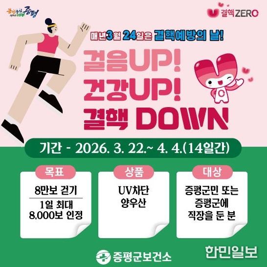 한민일보 서울포커스 김다남 기자 | 증평군보건소가 제16회 결핵예방의 날(3월 24일)을 맞아 오는 4월 3일까지 모바일 앱‘워크온’을 활용해 ‘걸음 UP! 건강 UP! 결핵 DOWN!’슬로건으로 걷기 챌린지를 실시한다.