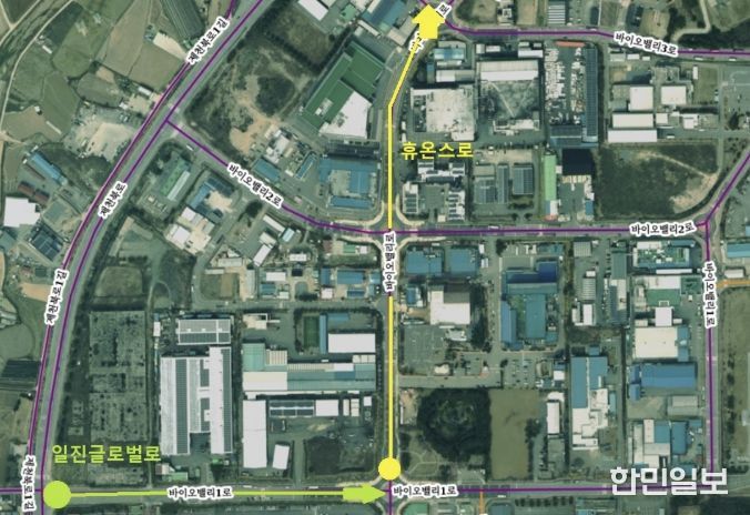시는 지난 1월 기업 유치와 국제 교류 확대를 위해 지역 경제 활성화와 사회 발전에 기여한 휴온스와 일진글로벌의 기업 명칭을 활용해 ‘휴온스로’와 ‘일진글로벌로’를 부여했다. 명예도로명의 사용 기간은 5년 이내이며, 우편물 수령 등 실제 주소로는 사용할 수 없다.