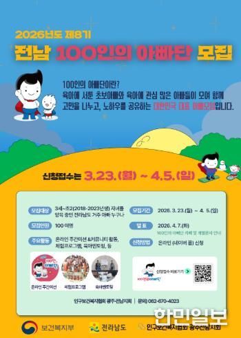 한민일보 서울포커스 박정민 기자 | 전라남도는 아빠의 육아 참여를 확대하고 가족 중심의 건강한 양육문화를 확산하기 위해 2026년 제8기 전남 100인의 아빠단 참여자를 모집한다.