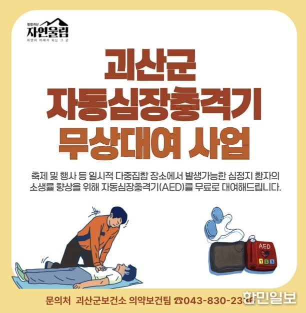 한민일보 서울포커스 김다남 기자 | 충북 괴산군보건소는 관내 축제와 행사장에서 발생할 수 있는 심정지 사고에 대비해 ‘자동심장충격기(AED) 무상 대여 사업’을 추진한다고 24일 밝혔다.