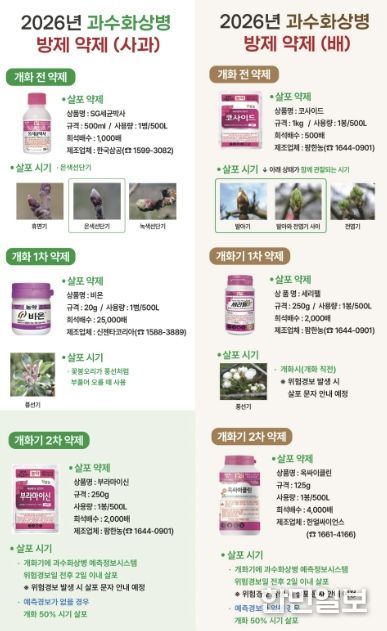 이번에 공급된 약제는 발아 전 1회, 개화기 2회 등 총 3회 살포하도록 구성됐다. 발아 전에는 사과 ‘SG세균박사’, 배 ‘코사이드’를 사용하고, 개화기에는 사과 ‘비온(1차)’, ‘부라마이신(2차)’, 배 ‘세리펠(1차)’, ‘옥싸이클린(2차)’을 시기에 맞춰 순차적으로 살포해야 한다.
