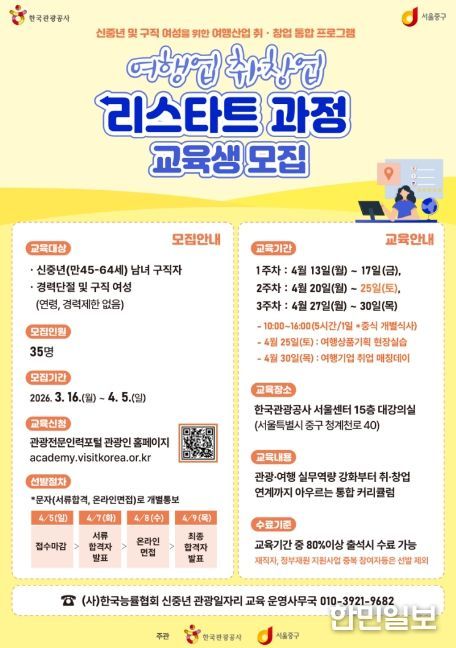 한민일보 서울포커스 김서윤 기자 | 서울 중구가 한국관광공사와 함께 관광업계 구인난 해소와 지역 기반 일자리 창출을 목표로 '여행업 취·창업 리스타트 과정'을 다음달 13일부터 운영한다.
