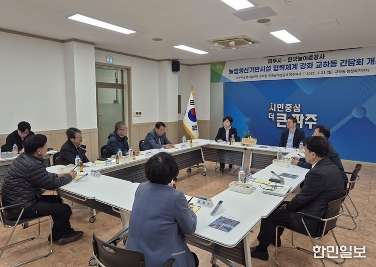한민일보 서울포커스 진광성 기자 | 파주시농업기술센터는 지난 23일 교하동 행정복지센터에서 한국농어촌공사 파주지사와 함께 농업생산기반시설의 효율적 관리를 위한 협력 방안을 논의하는 간담회를 개최했다.