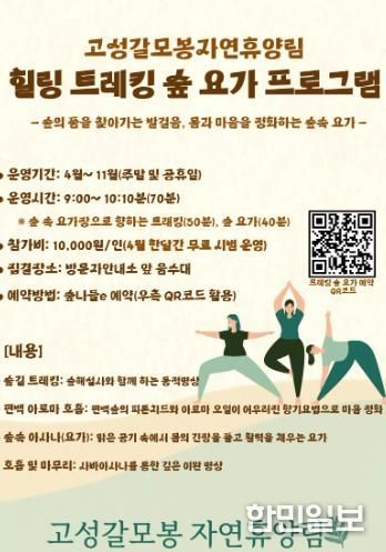 한민일보 서울포커스 김은금 기자 | 고성군은 갈모봉 자연휴양림에서 ‘힐링 트레킹 숲 요가’ 프로그램’을 오는 4월부터 11월까지 운영한다고 밝혔다.