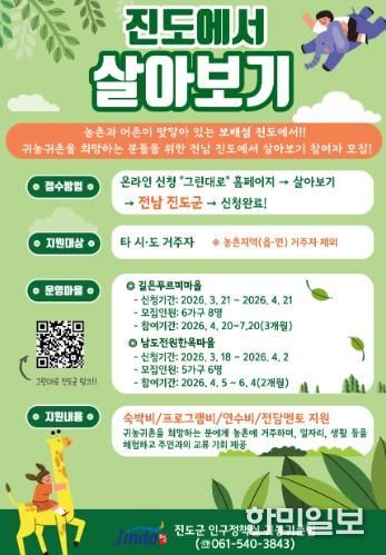 진도군 관계자는 “귀농, 귀어, 귀촌을 희망하는 분들이 이번 사업을 통해 농어촌 생활을 직접 경험하고, 안정적인 정착을 준비할 수 있기를 기대한다”라며, “보배섬 진도에서 새로운 삶을 시작할 수 있도록 적극 지원하겠다”라고 말했다.
