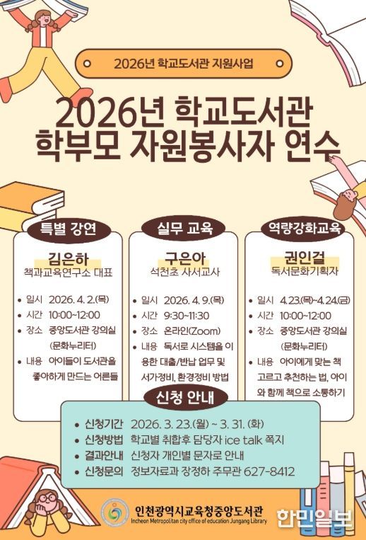 한민일보 서울포커스 유창렬 기자 | 인천광역시교육청중앙도서관은 학교도서관 학부모 자원봉사자들의 전문성을 높이고 자녀와의 소통 능력을 함양하기 위해 ‘2026년 학교도서관 학부모 자원봉사자 연수’를 운영한다.